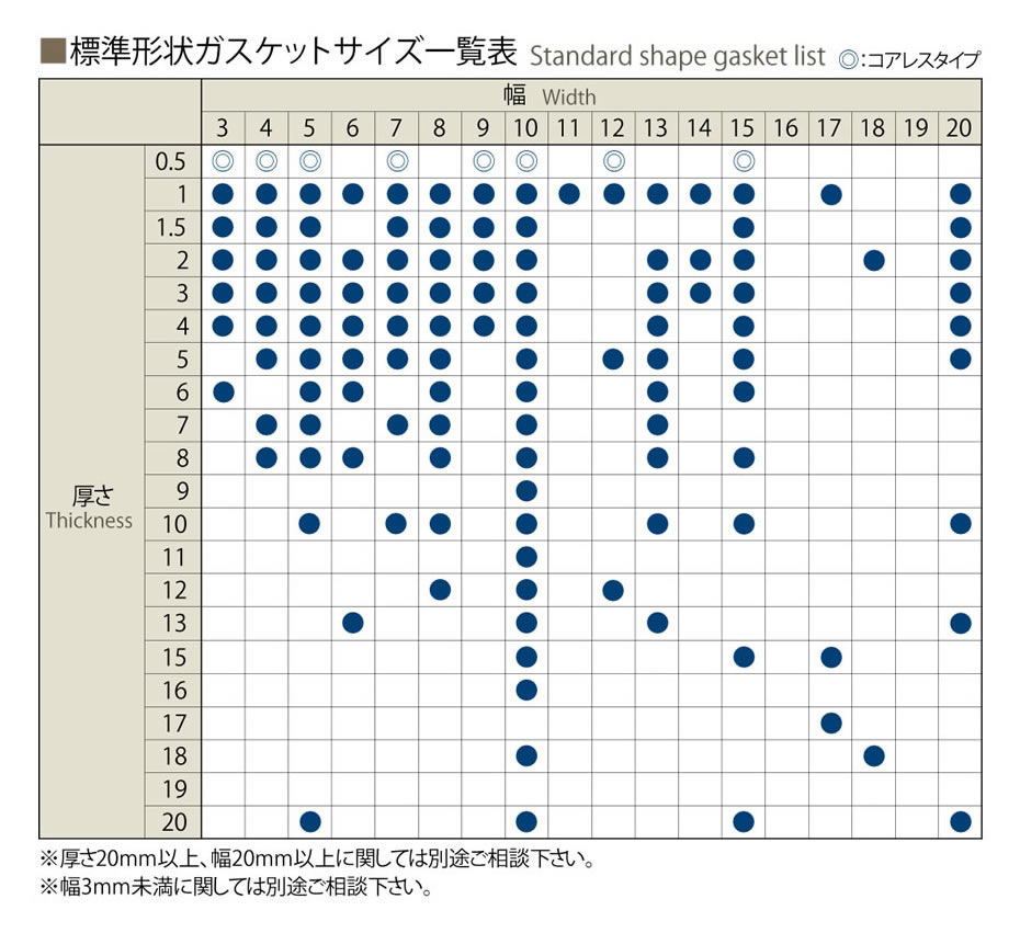 標準形状ガスケット一覧表以外のサイズも製造しておりますのでお問い合わせ下さい。*一部製品除く